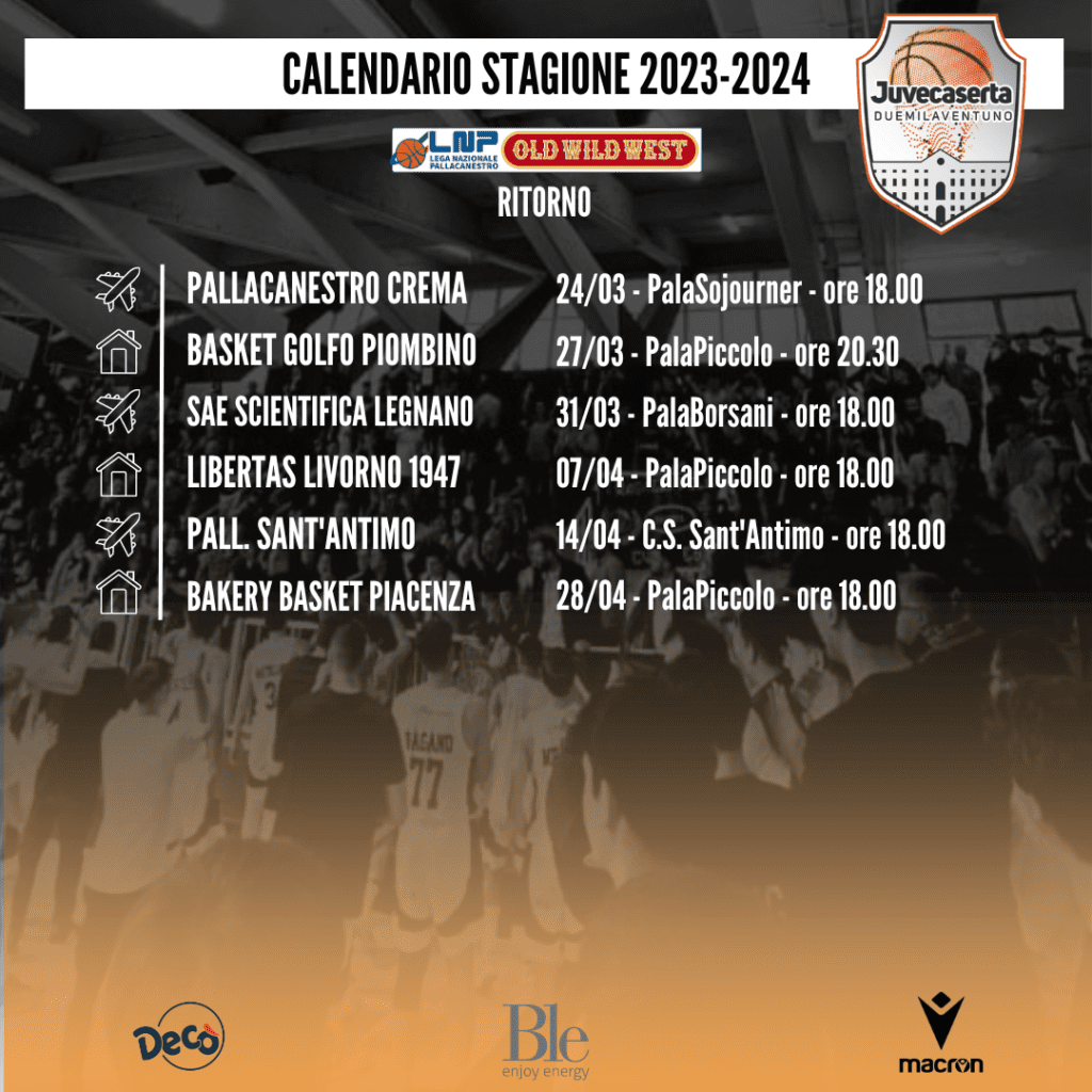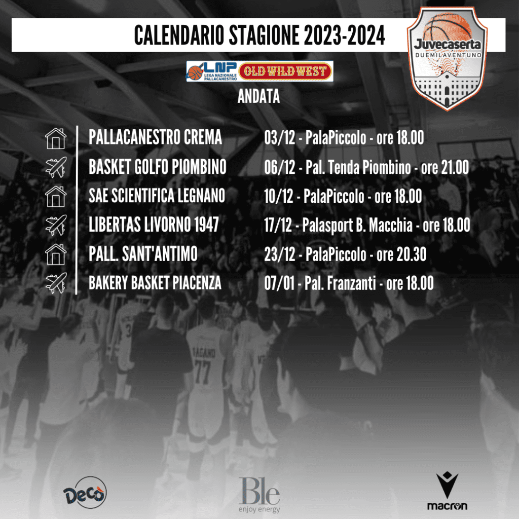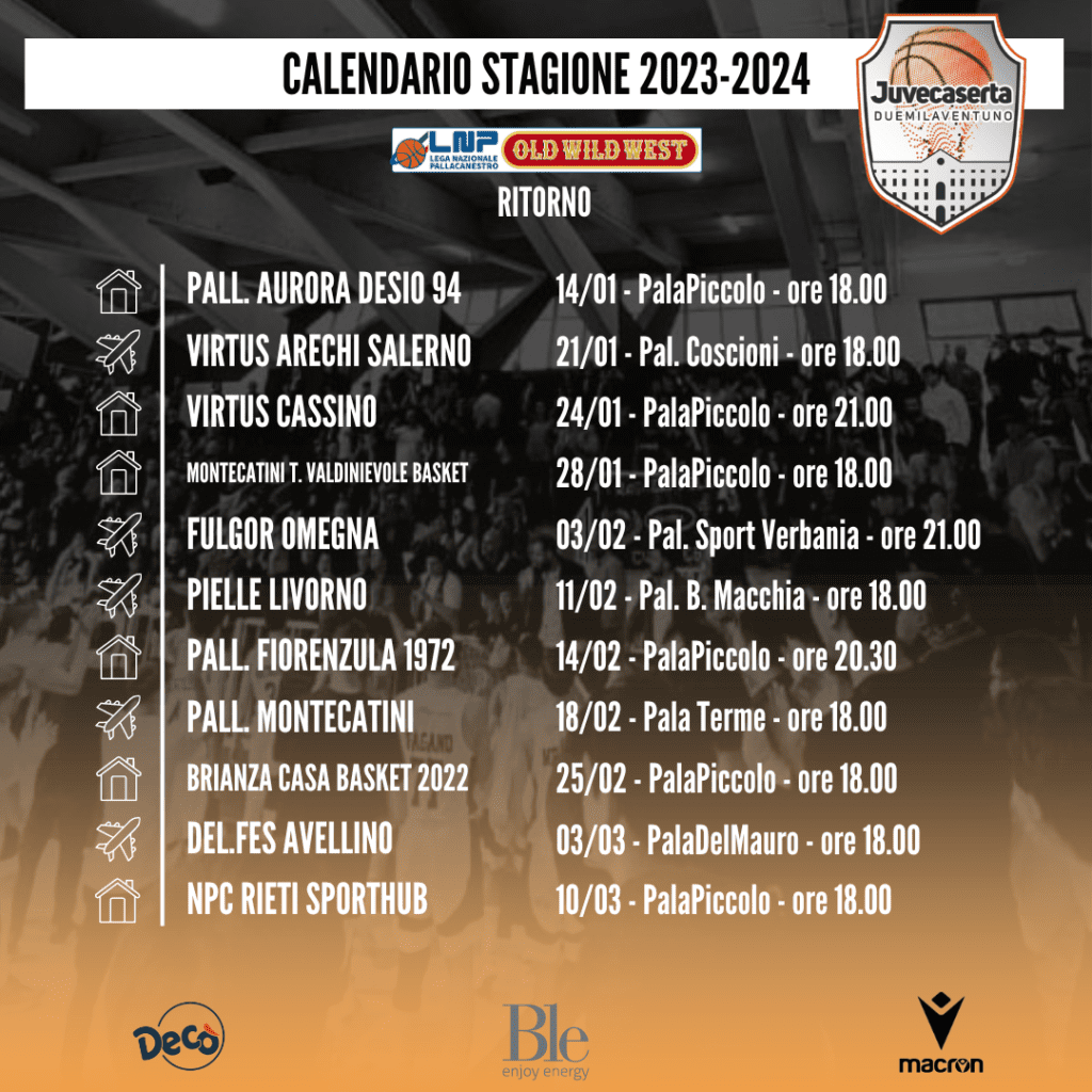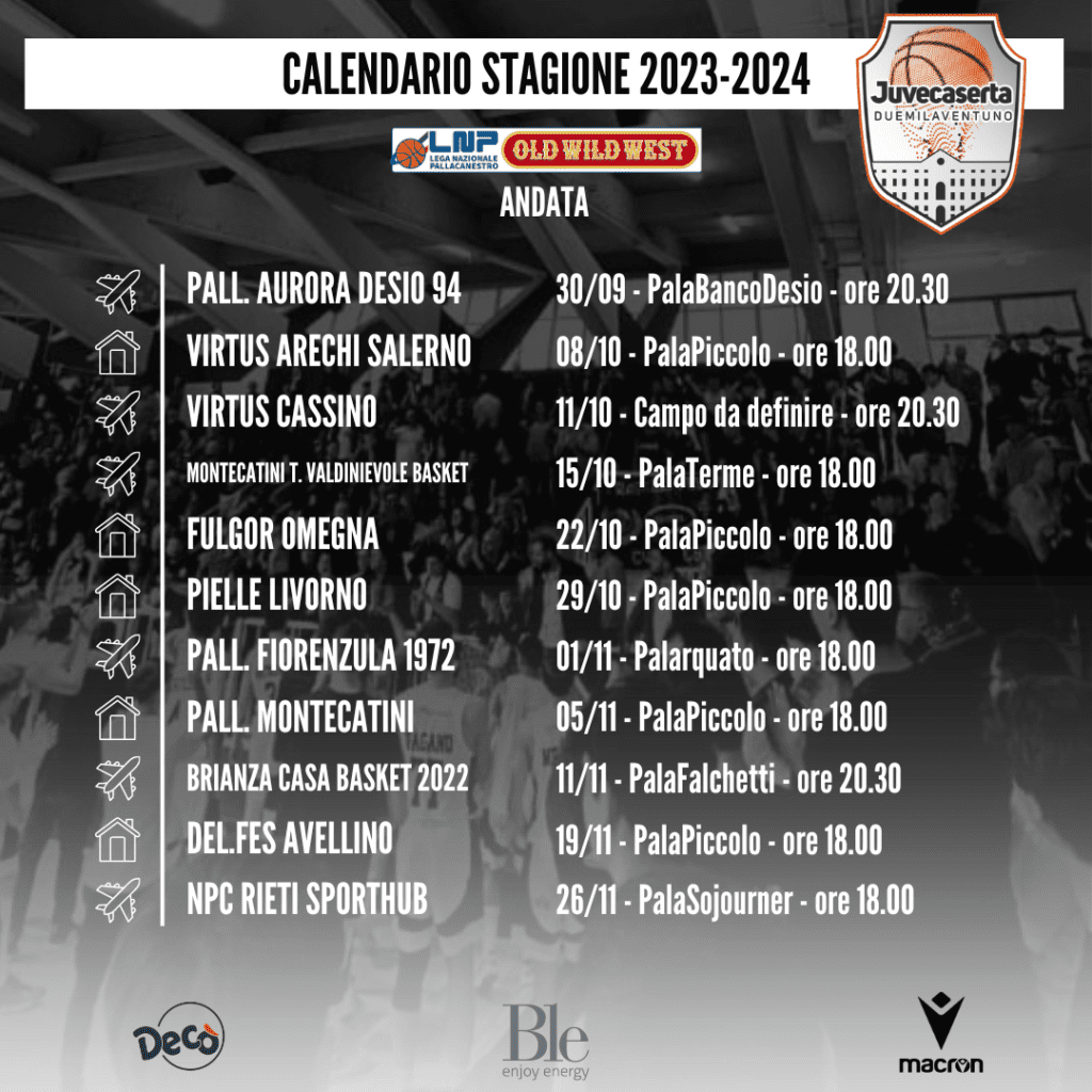 La Ble Decò Juvecaserta 2021 esordirà sabato 30 settembre, in una tipica serata lombarda sul parquet di Desio, e una settimana dopo si presenterà innanzi ai suoi tifosi per il primo derby di stagione contro Salerno. Subito poi una doppia trasferta, con l’infrasettimanale a Cassino al mercoledì e il primo viaggio a Montecatini, in casa Herons. Caserta per 15 giorni resta all’ombra della Reggia, ospitando Omegna prima e la Pielle Livorno per poi andare a Fiorenzuola nella ricorrenza della festa di Ognissanti, il 1 Novembre. Subito dopo in sequenza la Gema Montecatini sul parquet amico e a seguire un altro sabato sera lombardo, in trasferta a Treviglio sul campo di Brianza. Derby con Avellino fissato per il 19 novembre, con l’andata che vedrà i bianconeri a essere i padroni di casa, con a seguire la trasferta su un altro parquet storico come quello di Rieti. Il mese di dicembre si apre contro Crema, con a seguire la terza trasferta infrasettimanale del girone di andata contro Piombino e la sfida contro Legnano. Calendario fittissimo fino alle feste natalizie, con Libertas Livorno il 17/12, ed il derby contro Sant’Antimo, anche questo fra le mura amiche si sabato 23. Si riprende con l’ultima giornata del girone di andata che è fissata per il giorno dopo l’Epifania, quando i bianconeri saranno ospiti di Piacenza. Di qui in avanti la girandola del girone di ritorno, con i campi invertiti. Vanno comunque segnalati il derby di ritorno a Salerno, fissato per il 21 Gennaio, gli infrasettimanali casalinghi del 24 gennaio contro Cassino, di San Valentino contro Fiorenzuola e quello del 27 marzo contro Piombino. Il return match del PalaDelMauro ad Avellino è del 3 marzo, quello contro Sant’Antimo per il 14 aprile. Chiusura della regular season il 28 aprile in casa contro Piacenza. Si gioca a ritmi serrati, con due sole pause: quella della Coppa Italia, tra l’undicesima e la dodicesima di ritorno, precisamente tra il 10 e il 24 marzo, e quella di Pasqua che concederà alle squadre un turno di riposo proprio prima degli ultimi 40’ di regular season.
