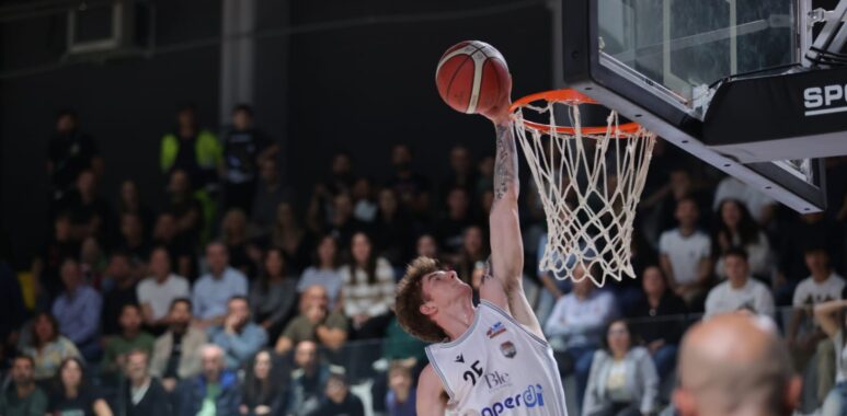 Ultima frazione con i padroni di casa che ritornano avanti in doppia cifra con un parziale di 5-0 (70-60) grazie a due liberi di Radunic (ancora una doppia/doppia per lui con 10 punti e 16 rimbalzi) ed una tripla di Nobile. Qualche problema di falli e la stanchezza non consentono ai padroni di casa di chiudere il confronto e di questo ne approfittano gli ospiti per recuperare fino al -2 con un canestro di Raffaelli (71-69) dopo 4’49”. Sono due liberi di Hadzic a dare più di un possesso di vantaggio ai bianconeri, che, poi, ampliano a +6 con una schiacciata di Ly-Lee. Ed è lo stesso camerunense decisivo nella propria metà campo con una stoppata su Rasio, che chiude praticamente il confronto.